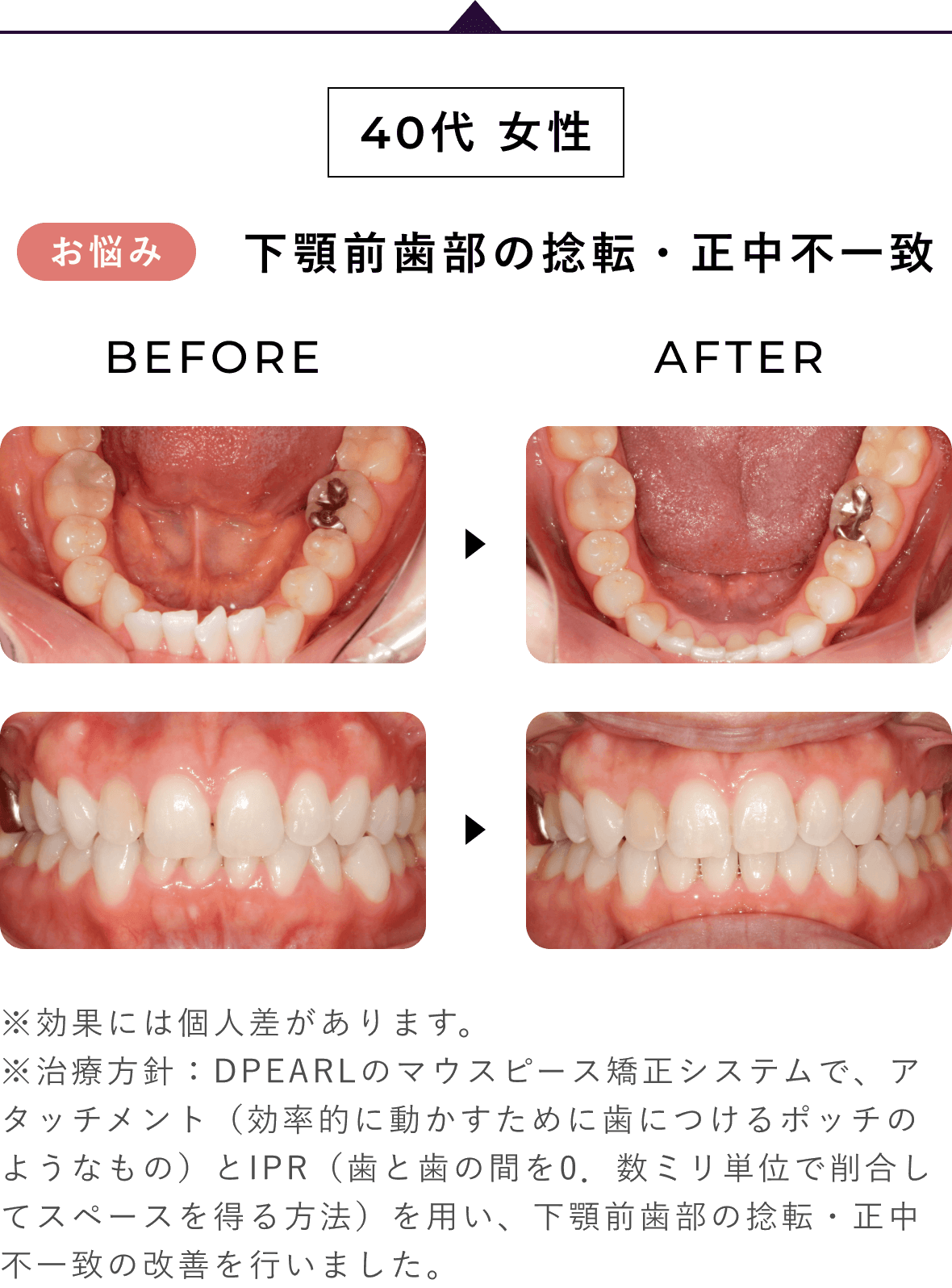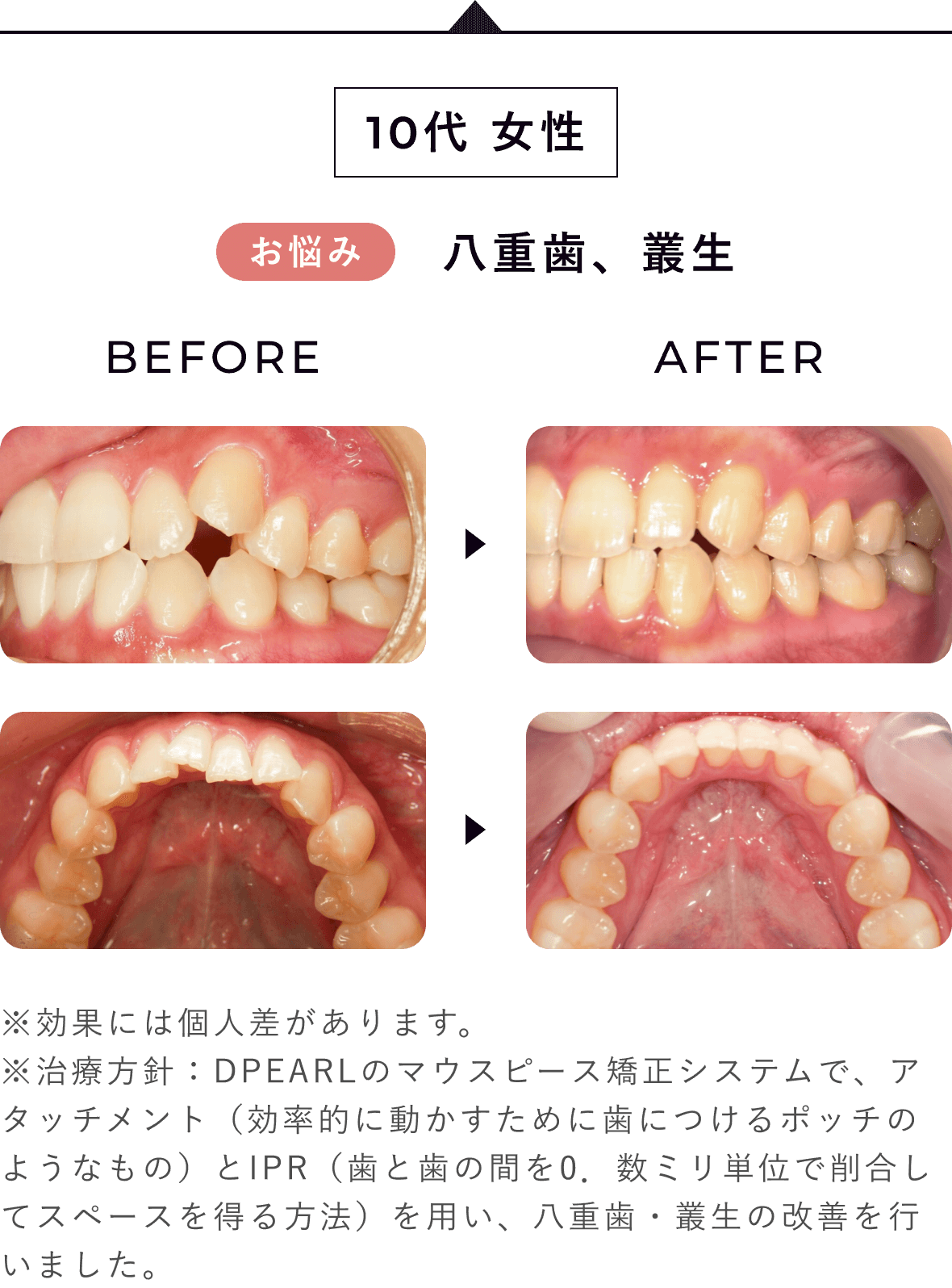 ※治療方針:アタッチメントを用いた上顎前歯部の前突・八重歯の改善
