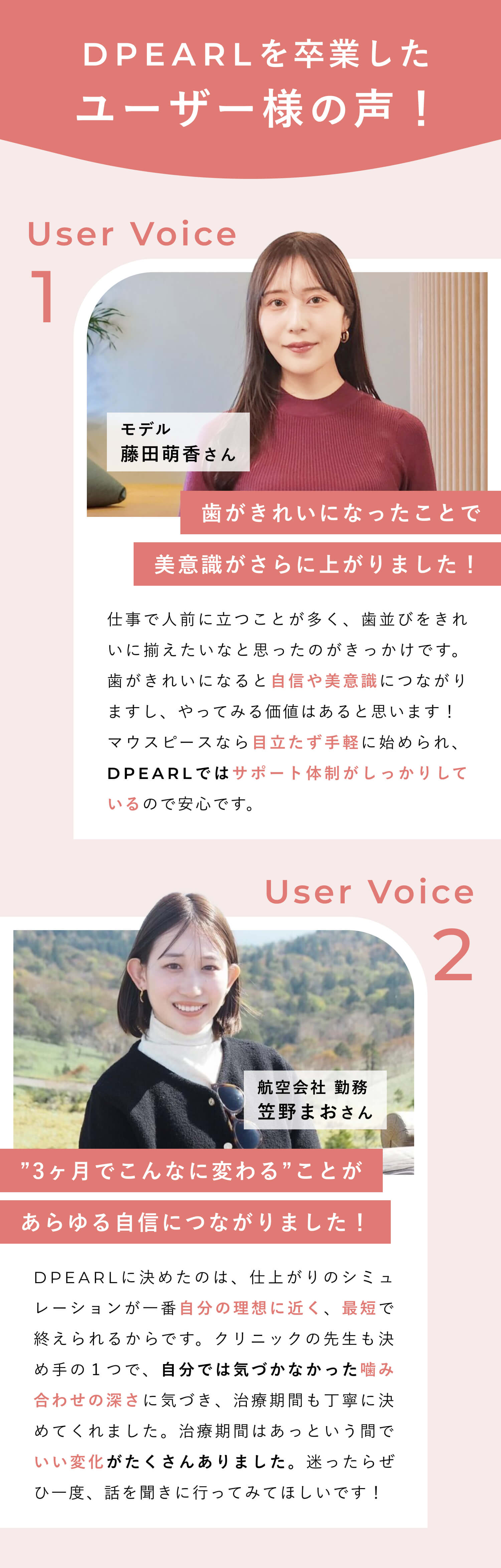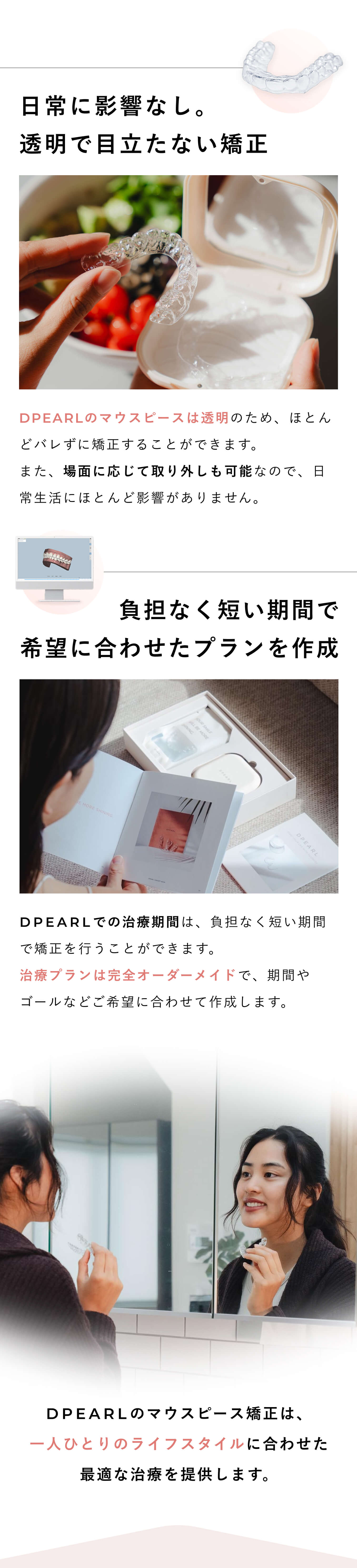 矯正終了後、歯は元の位置に戻ろうとする傾向があります。それを防ぐため、リテーナーと呼ばれる歯の移動を防ぐマウスピースの装着を推奨しております。※リテーナーの費用はプラン料金に含まれています。