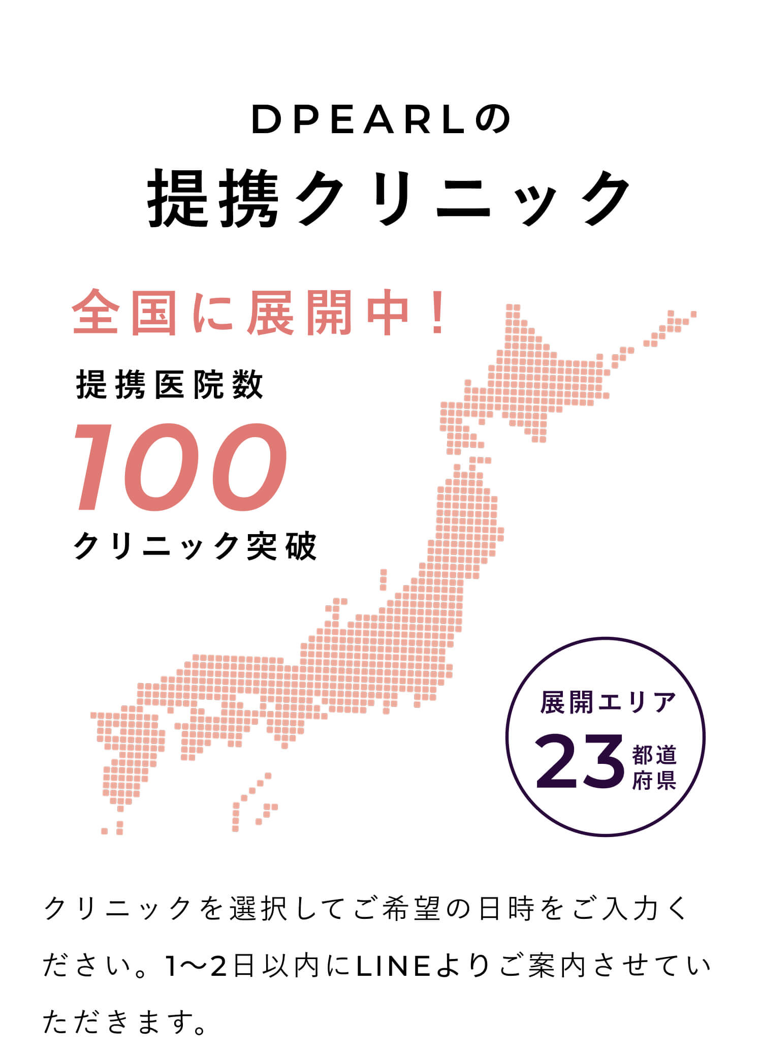 現在、DPEARLは提携クリニックを全国エリアに拡大しております。最新のクリニック情報は公式LINEにて随時配信しておりますので、是非ご登録ください。