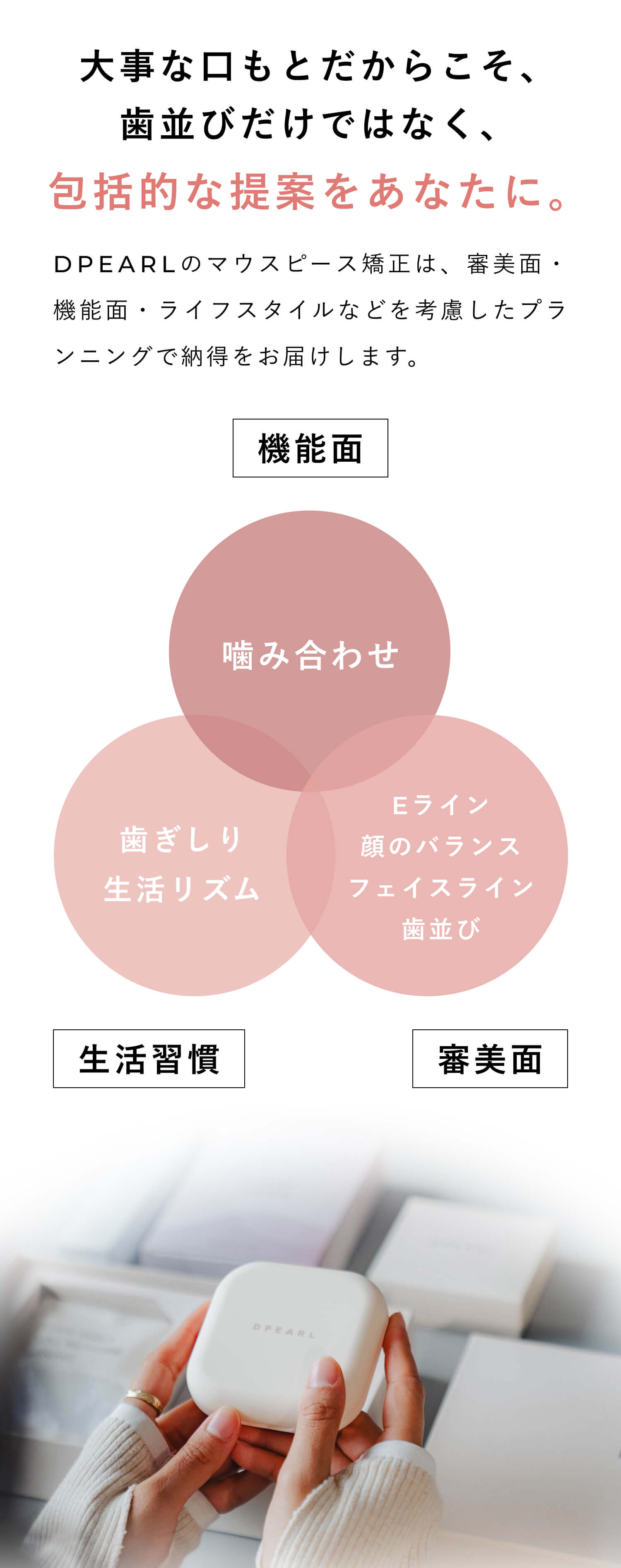 食べかす等が残ったままの装着は不衛生なため、飲食後は歯を磨いてからのマウスピース装着をお願いしております。