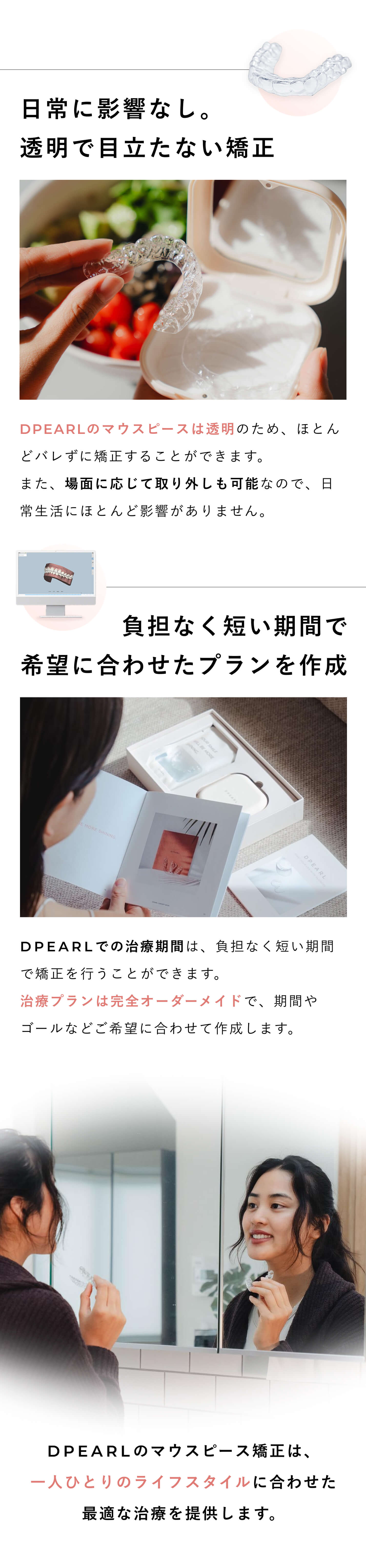 矯正終了後、歯は元の位置に戻ろうとする傾向があります。それを防ぐため、リテーナーと呼ばれる歯の移動を防ぐマウスピースの装着を推奨しております。※リテーナーの費用はプラン料金に含まれています。